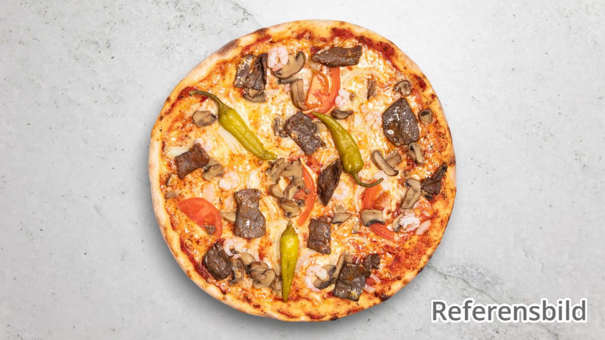 Tomatsås, ost, kebabkött (nötkött), skinka, tomater, kebabsås stark, kebabsås mild och feferoni.