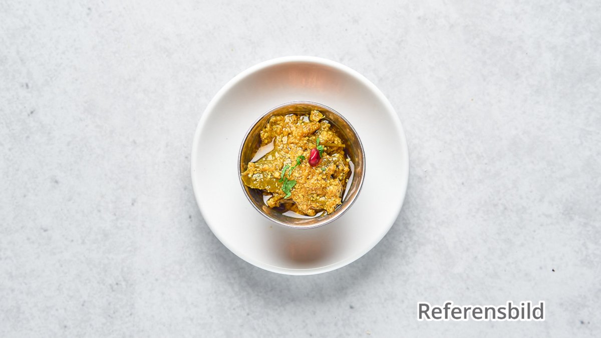 Beströdd med chaat masala, bockhornsklöverblad och rött chilipulver.