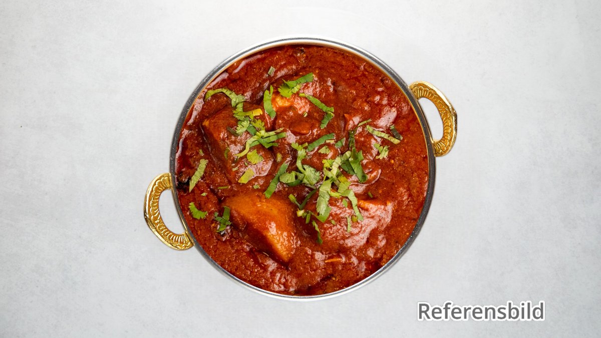 Biff tillagad i en sås av vindaloo kryddblandning.