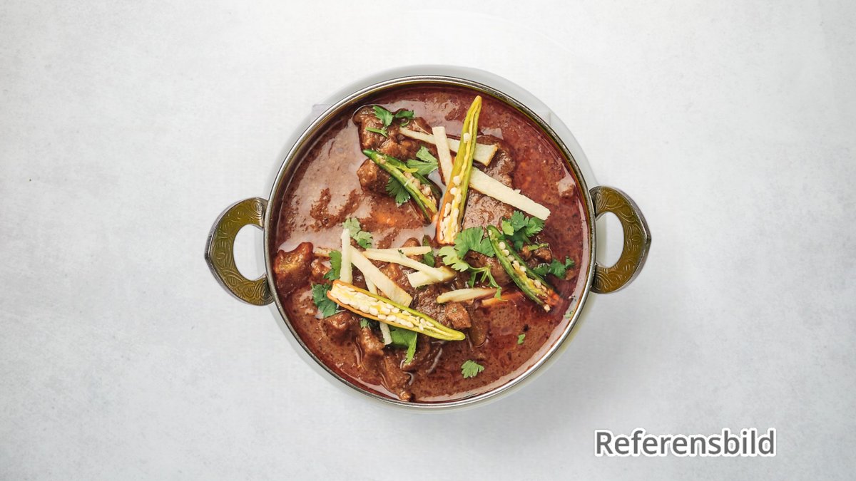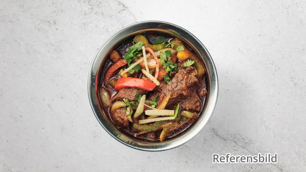 Biff tillagad i tomat och löksås med karahi kryddor.