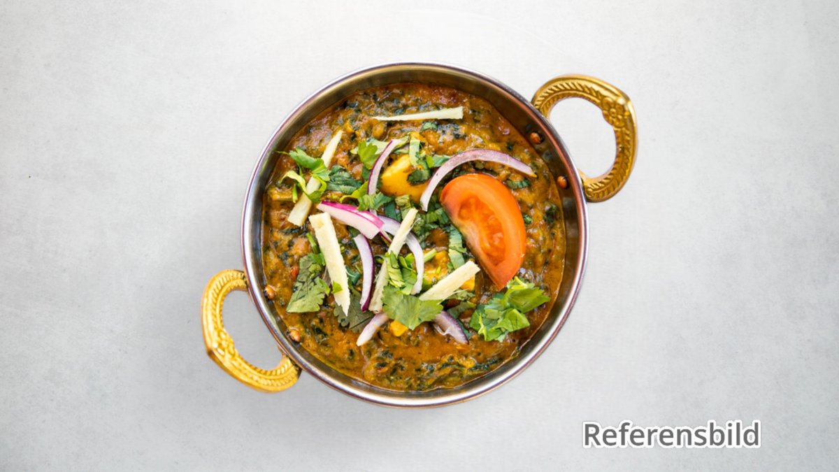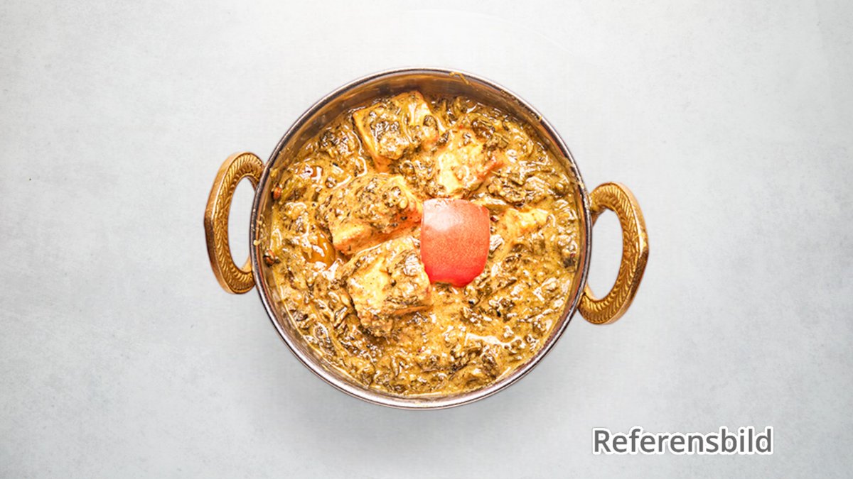 Spenat-och grillad paneer bitar med speciella indiska kryddor kokta i mild sås. Serveras med ris och sallad