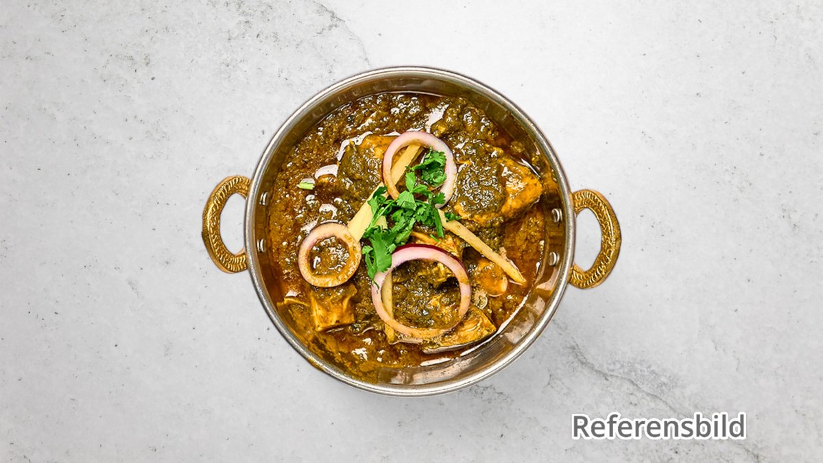 Kyckling i en sås av spenat, vitlök, ingefära, grön chili och indiska kryddor.