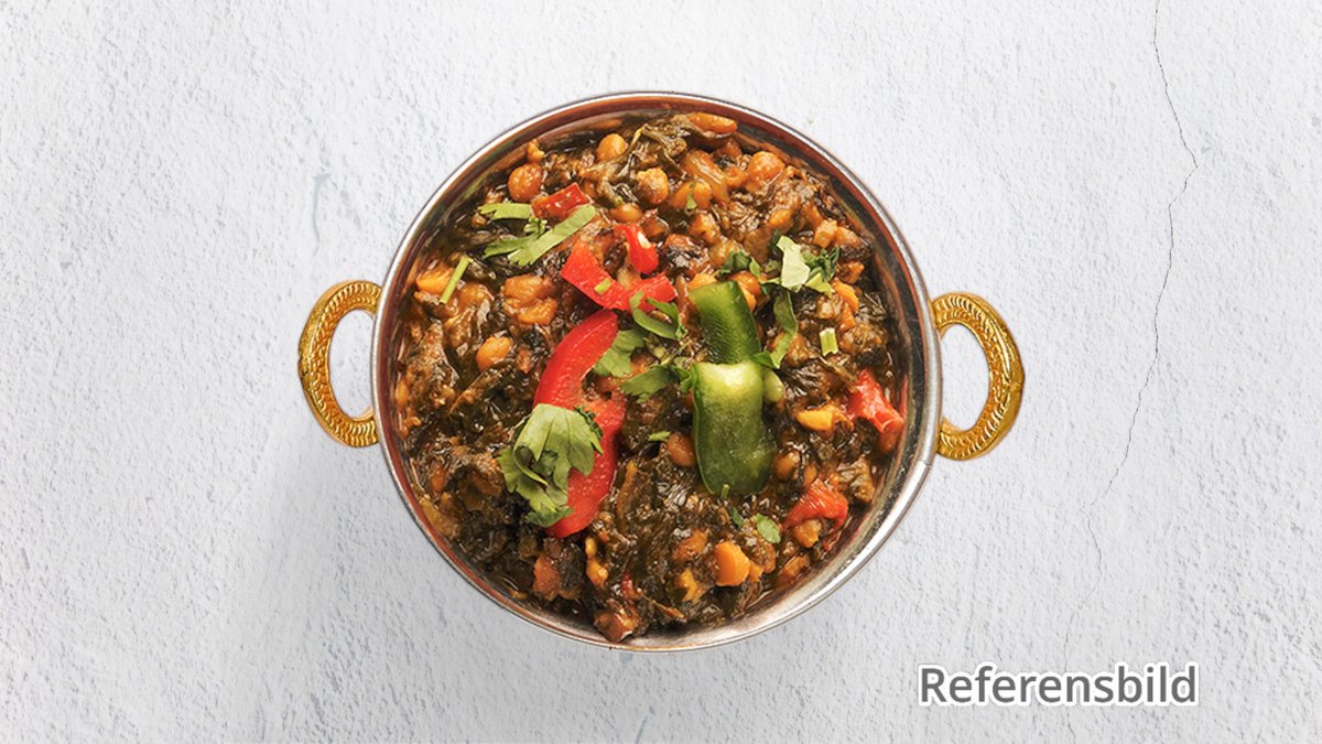 Spenat och kikåttör med speciella indiska kryddor kokta i mild sås. Serveras med ris och sallad