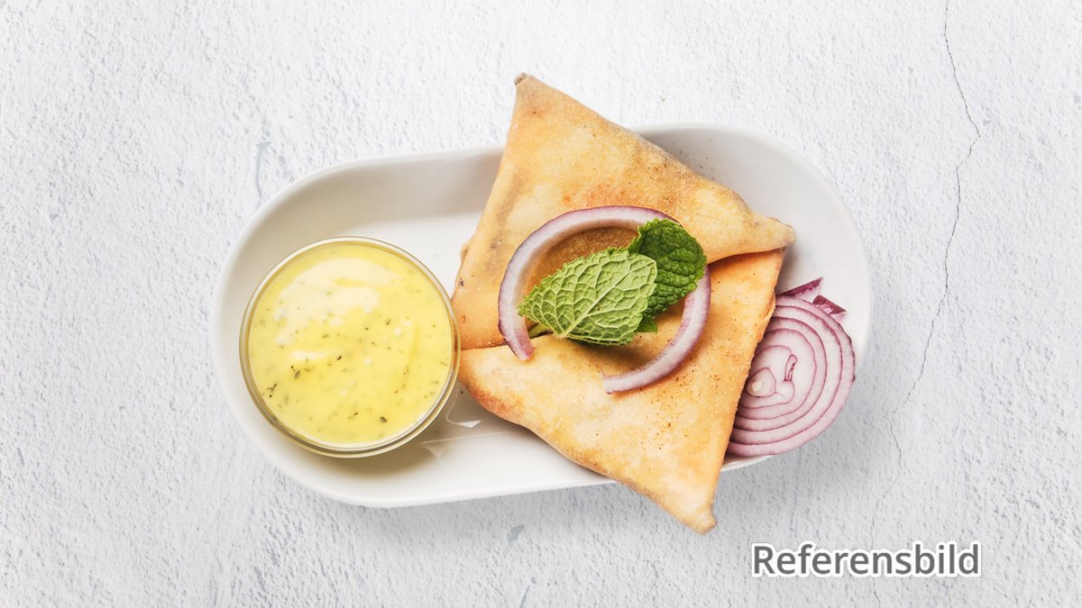 Indisk pirog fylld med kyckling, lök och kryddor.