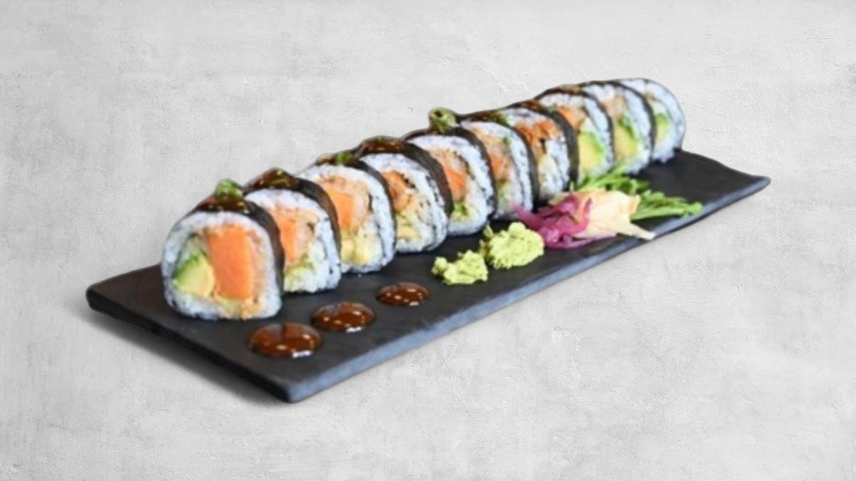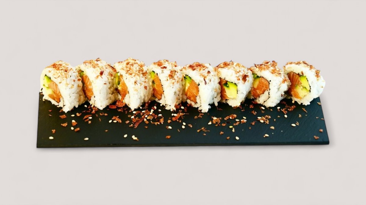 Lax och avokado. Toppas med grillad lax, chili majo, teriyaki sås, sesamfrön, salladslök och tobiko. Inkluderad wasabi, ingefära och soja (i burk). /SE, E, SO/