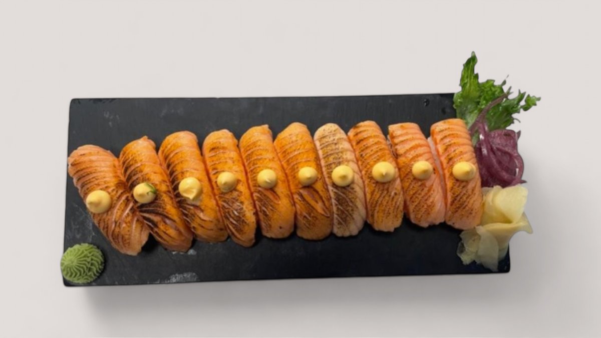 10 st grillad lax nigiri.Toppas med chili majo, teriyaki sås, salladslök och sesamfrön. /E, SE, SO/