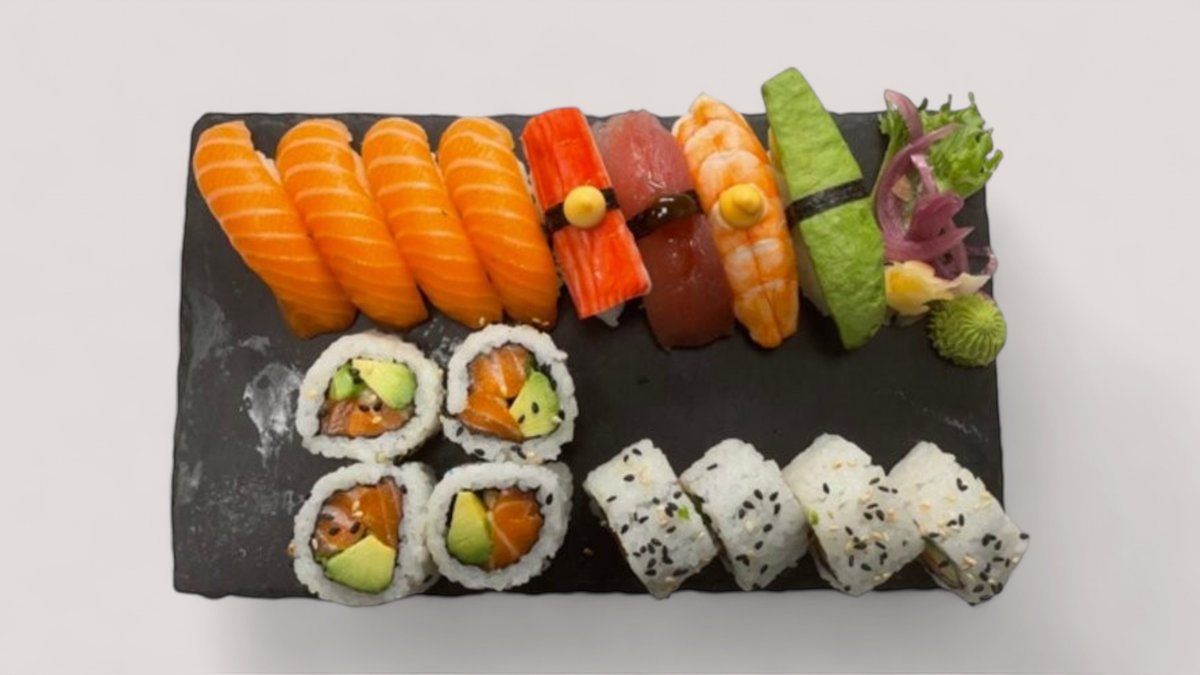 4 st lax maki, 2 lax nigiri, 2 avokado nigiri och 2 jätteräkor. Toppas med sesamfrön, chili majo och salladslök. Inkluderad wasabi, ingefära och soja (i burk).