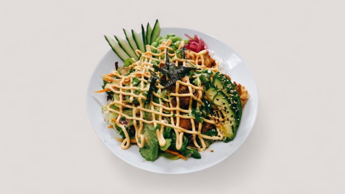 Friterad marinerad kyckling, avokado, gurka, salladsmix, sojabönor och sushiris. Serveras med hemlagad poke sås och chili majo.