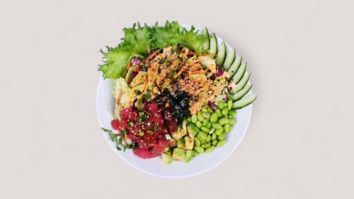 Friterad marinerad lax, avokado, gurka, salladsmix, sojabönor och sushiris. Serveras med hemlagad poke sås och chili majo.