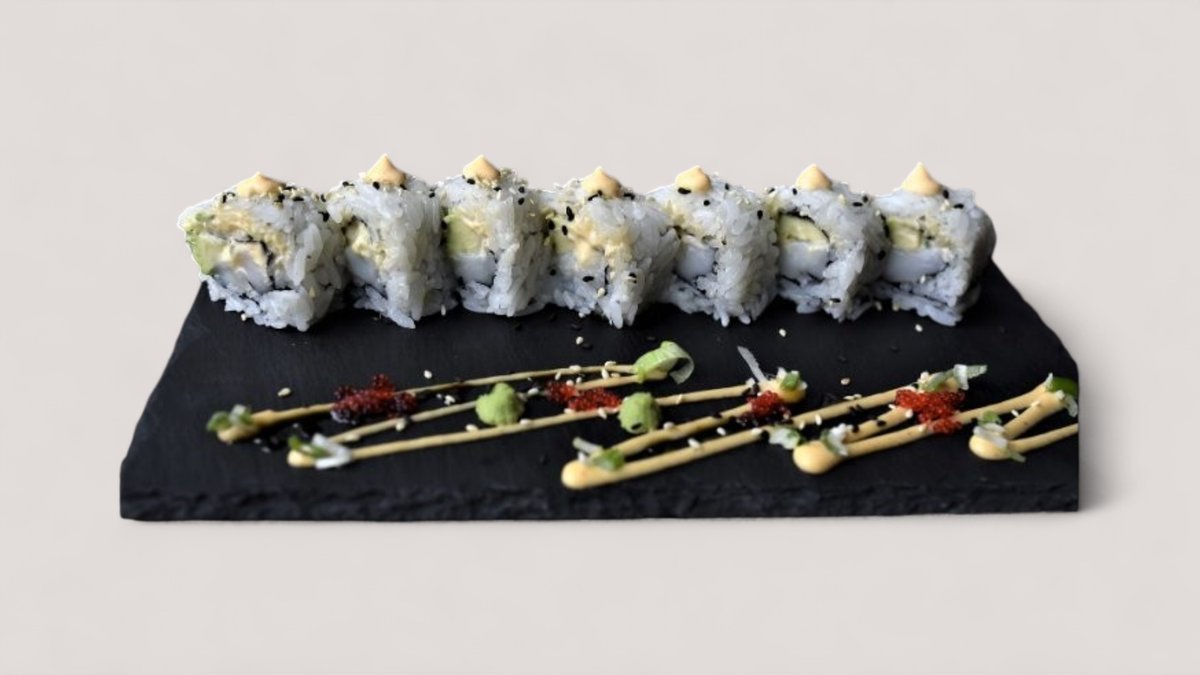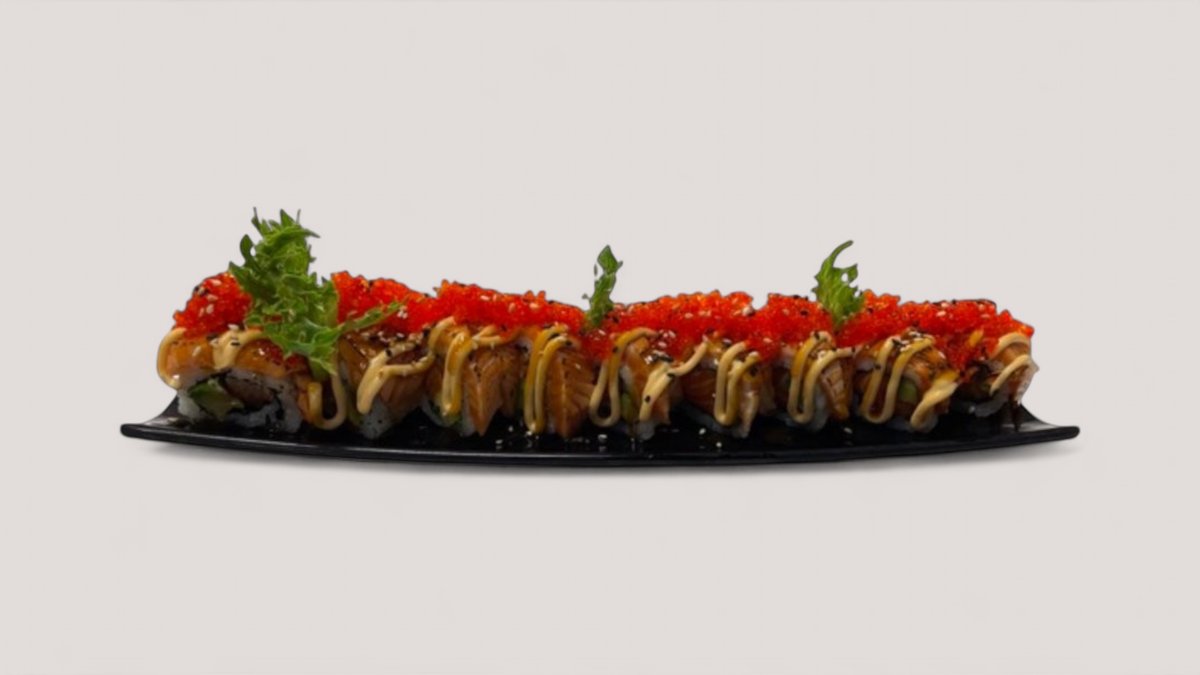 Friterad jätteräkor, avokado. Toppas med grillad lax, chili majo, teriyaki sås, sesamfrön, salladslök och tobiko.