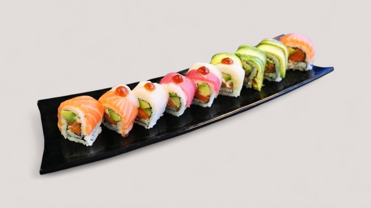 8 maki, 6 lax, 1 kisu fisk, 1 grillad tilapia, 2 tonfisk, 1 surimi, 1 jätteräkor och 1 avokado. Toppas med sesamfrön, teriyaki sås och chili majo. Inlagd wasabi, ingefära och soja (i burk).
