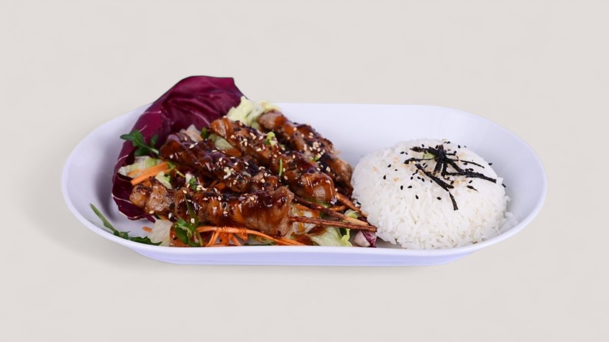 4st kyckling spets i teriyaki sås med sallad och ris. /SE, SO/