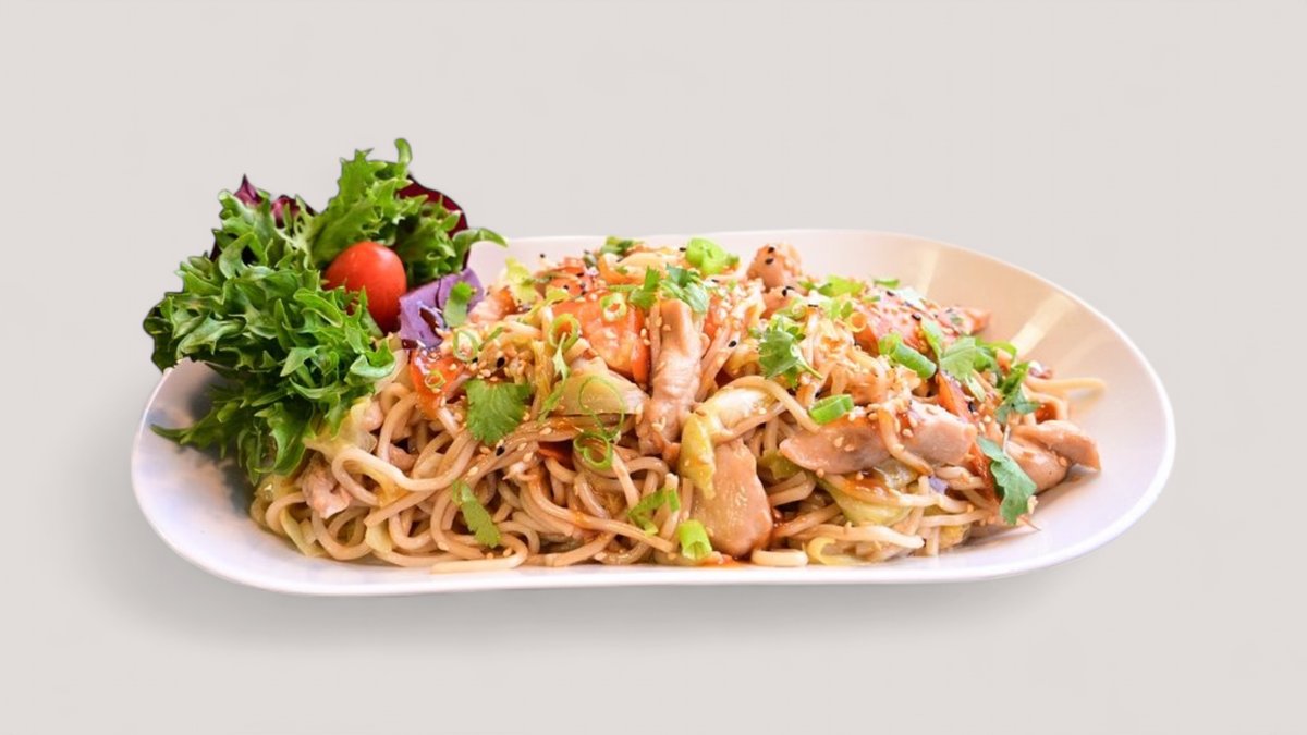 Stekta nudlar med kyckling eller jätteräkor och wokade grönsaker. /SE, SO/