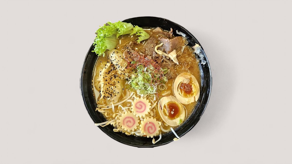 Lät hemlagad ramen med en smakrik buljong, marinerad biff, dumpling, böngroddar, grönsaker och kokt ägg. Allergi: sesam, ägg och soya.