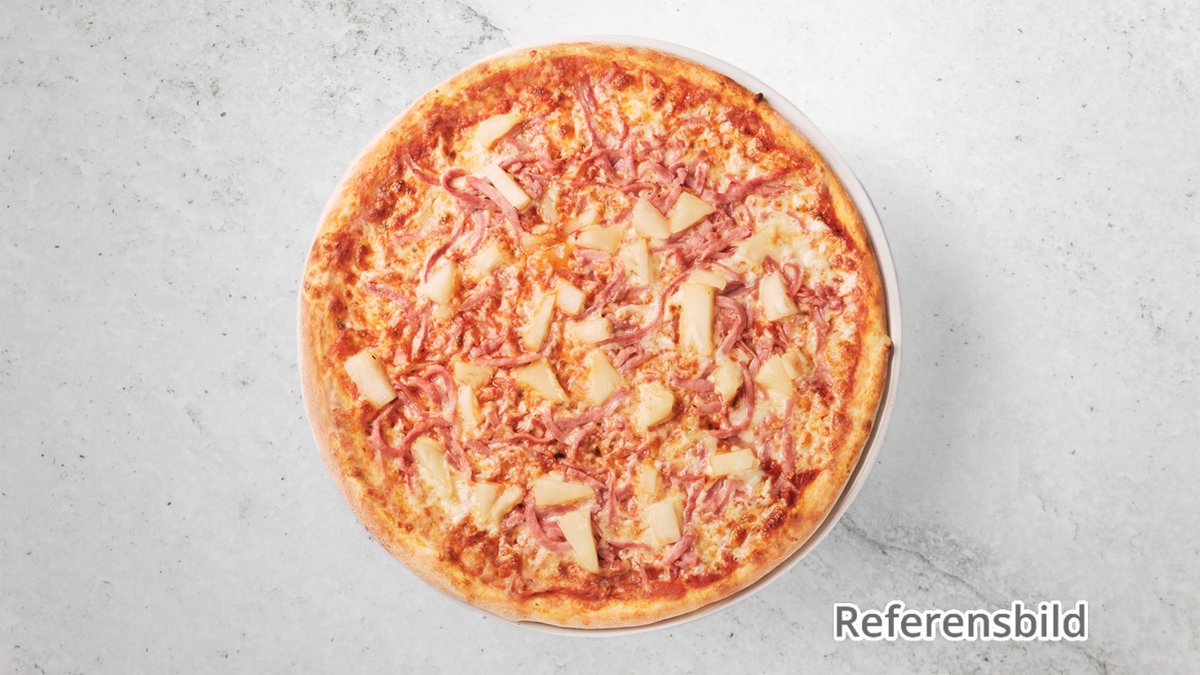 Tomatsås, ost, banan, ananas, skinka och curry.
