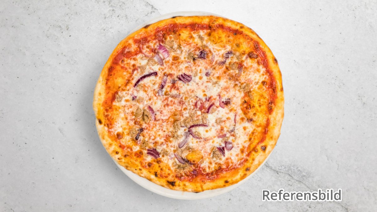 Tomatsås, mozzarellaost, oliver, soltorkade tomater, lök, vitost, vitlök och basilika.