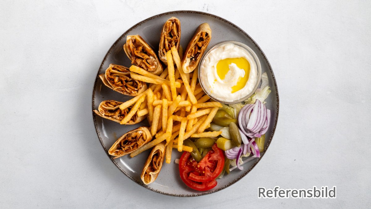 Tortilla kycklingshawarma, pommes frites, picklad gurka, dippsås och grönsaker.