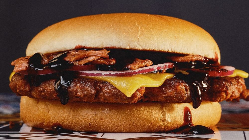 No Chicken patty med veganskt bacon, rödlök och blåbärs-BBQ.