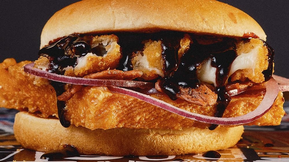 Barbequeburgare med friterad kyckling, Honey Mustard-dressing, sallad, tomat, rödlök, bacon, BBQ-sås och ost.