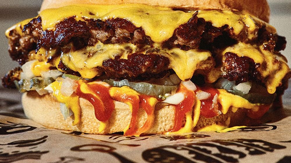 Dubbelburgare med svenskt nötkött med dubbel ost, senap och stekt gul lök.