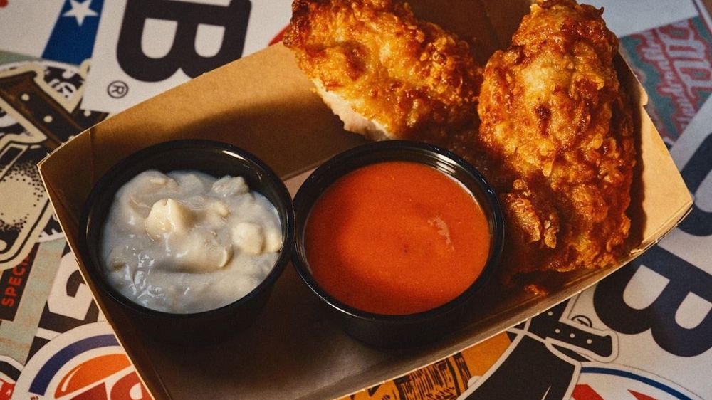 Shack fries topped with chicken tenders, melted cheese, Bastard Original dressing, jalapeños, and chopped yellow onions. Soda included.