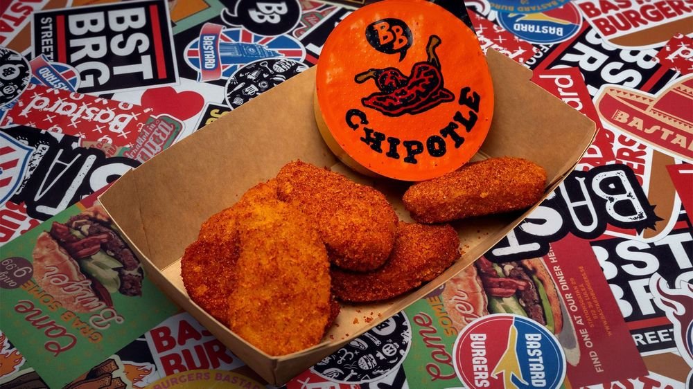 Spicy No-chicken nuggets och två valfria dippar.