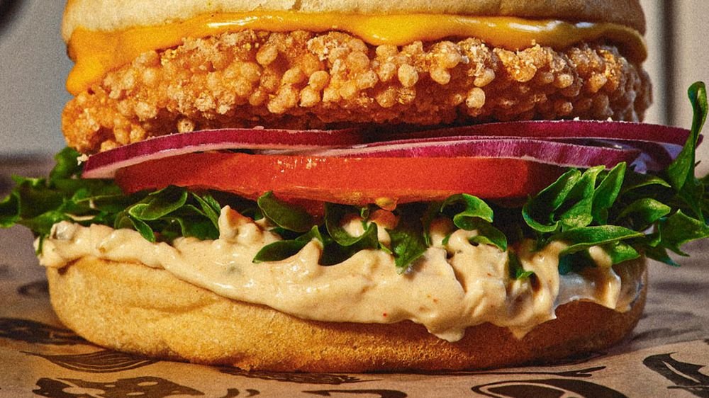 Streetburgare med friterad kyckling, mayo, hackad gul lök, pickles och ost.