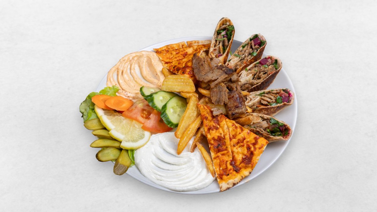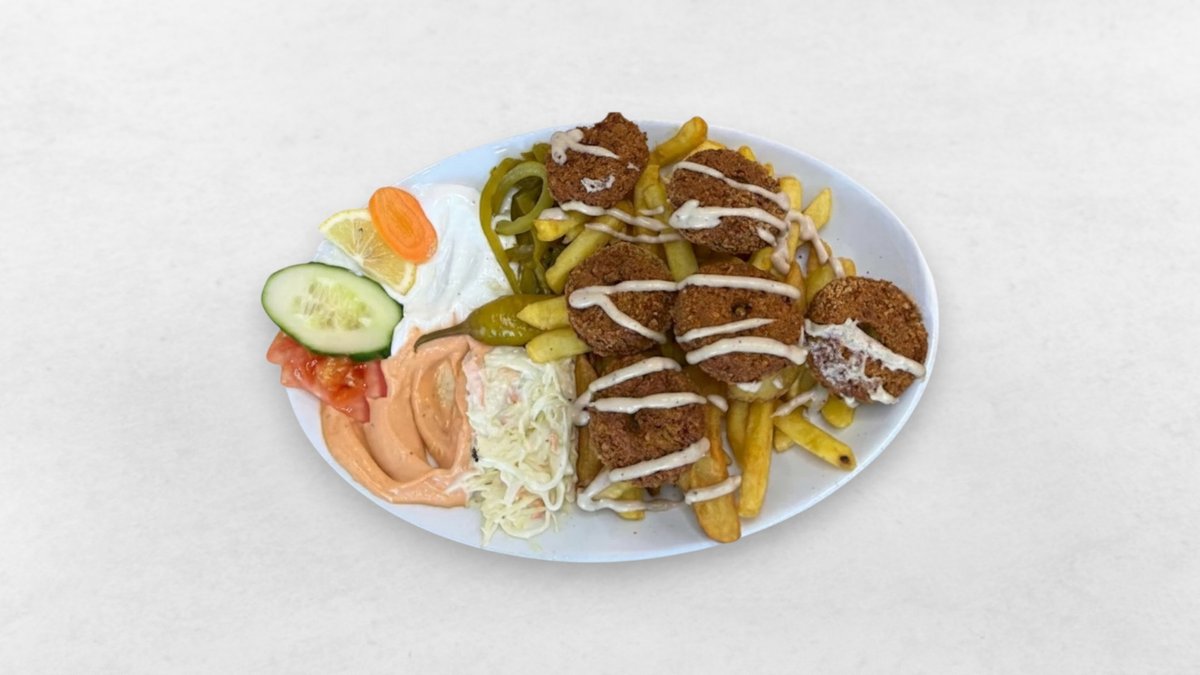 Falafel, hummus, sesamsås, pepperoni, sallad, tomat och ris eller pommes frites.