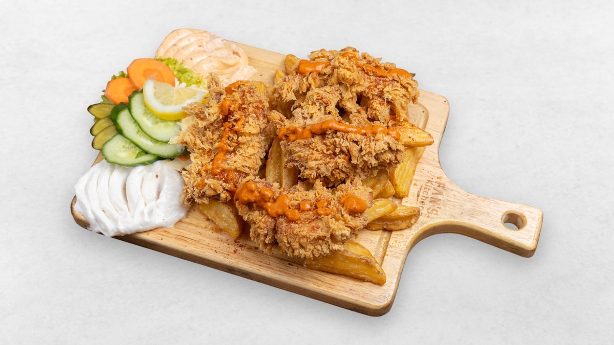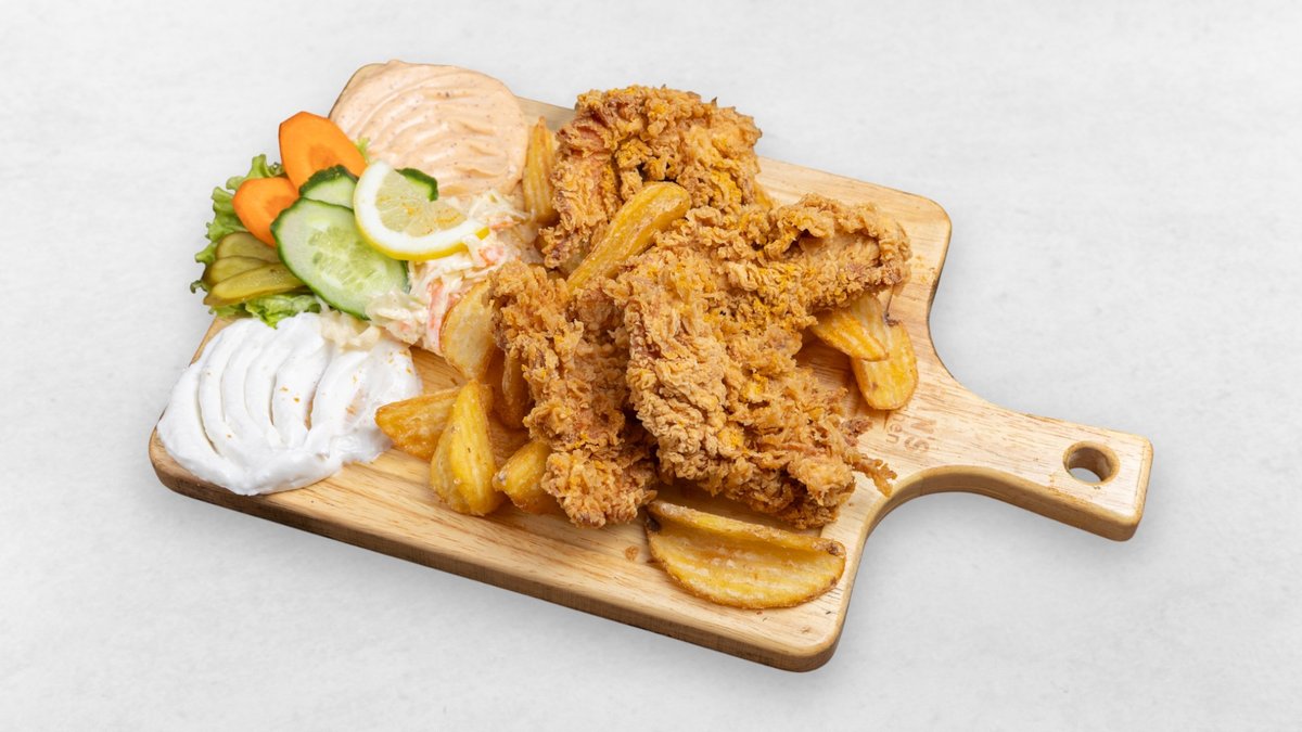 4 st krispiga kycklingbitar, tomat, coleslaw, pommes frites, cheddarost och emmentalerost.