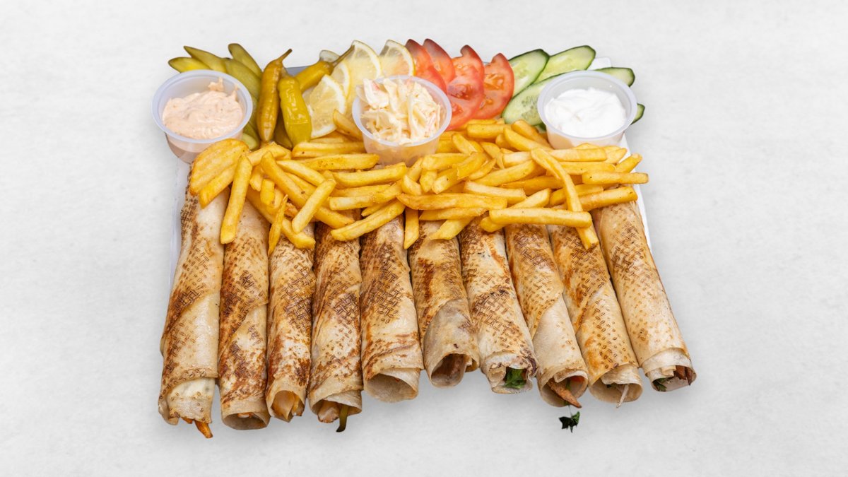 1 st liten kycklingrulle, pommes frites, vitlökssås, coleslaw och saltgurka.