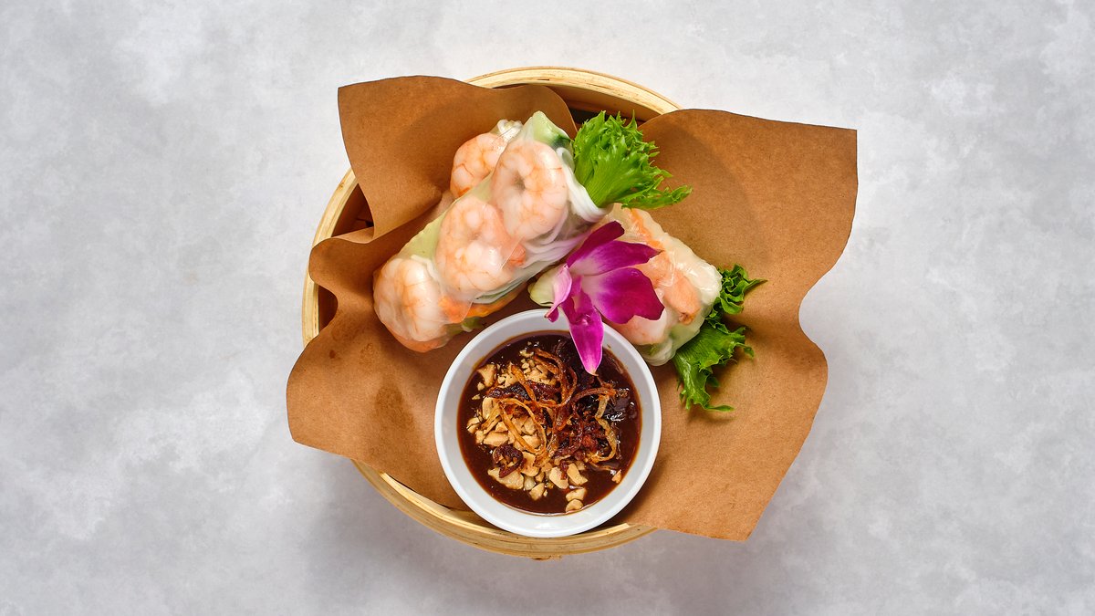 2 st. Färska sommarrullar med räkor, risnudlar, asiatiska örter, jordnötter och hemjord hoisin-sås