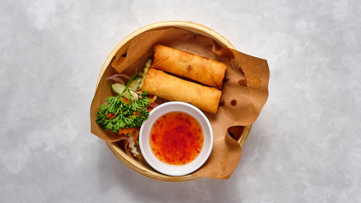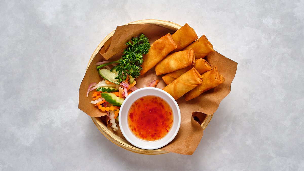 7 stycken friterade veganska vårrullar med sweetchilli-sås.