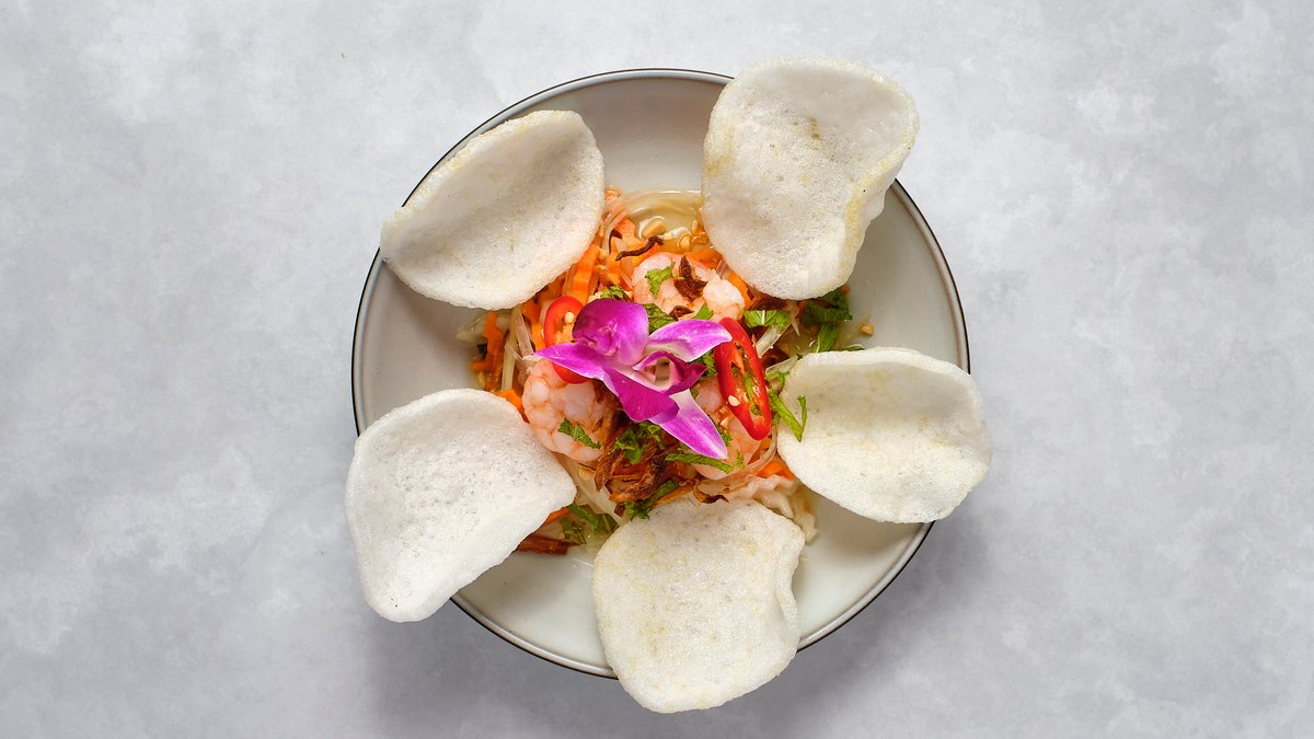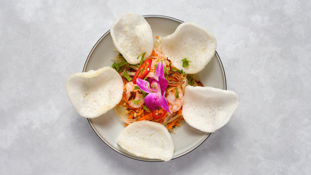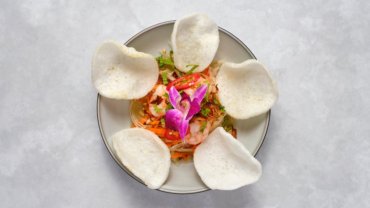 Papayasallad, räkor, asiatiska örter, jordnötter och hemgjord sås.