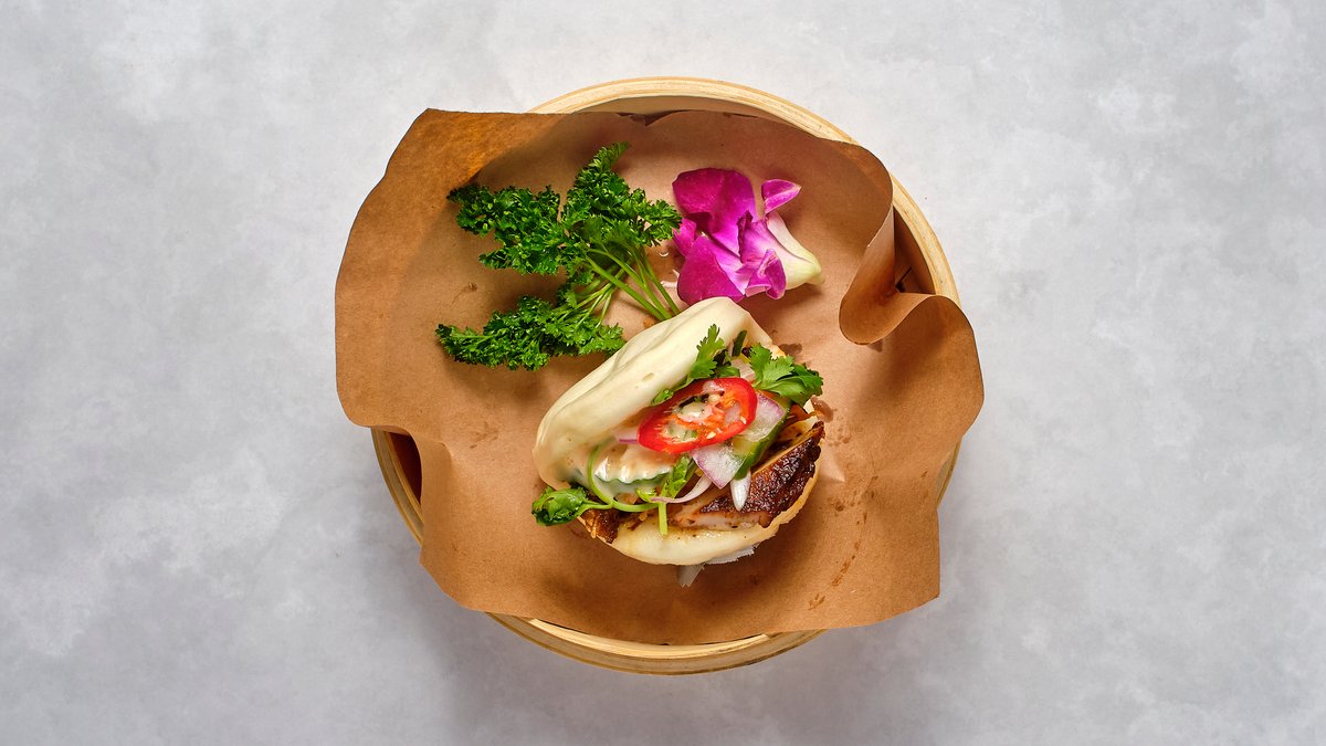 Bao Bun, grillad fläskfilé, sallad, chili dipp och grillsås.