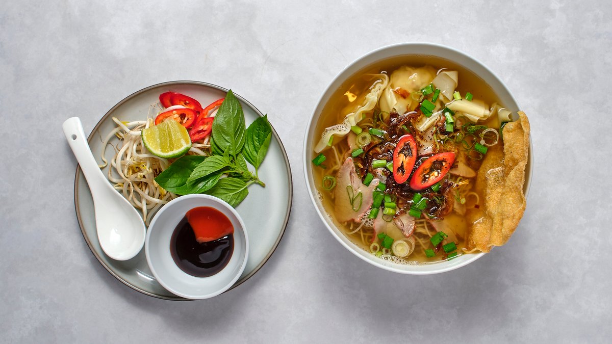 Risnudelsoppa, fläsksaté, wonton (kyckling, räkor), asiatiska örter på Vietnamesiskt sätt.