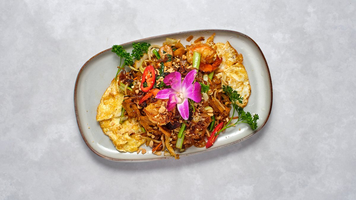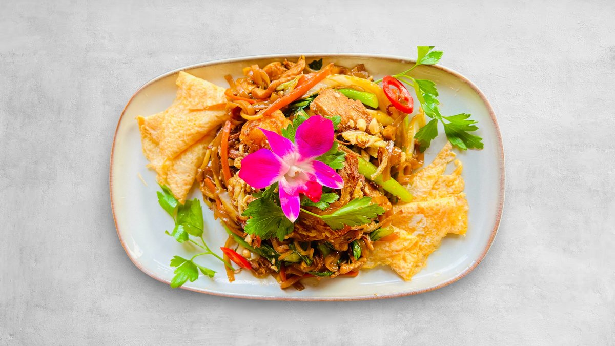 Grillad kyckling, risnudlar, asiatiska örter, jordnötter och hemgjord fisksås.