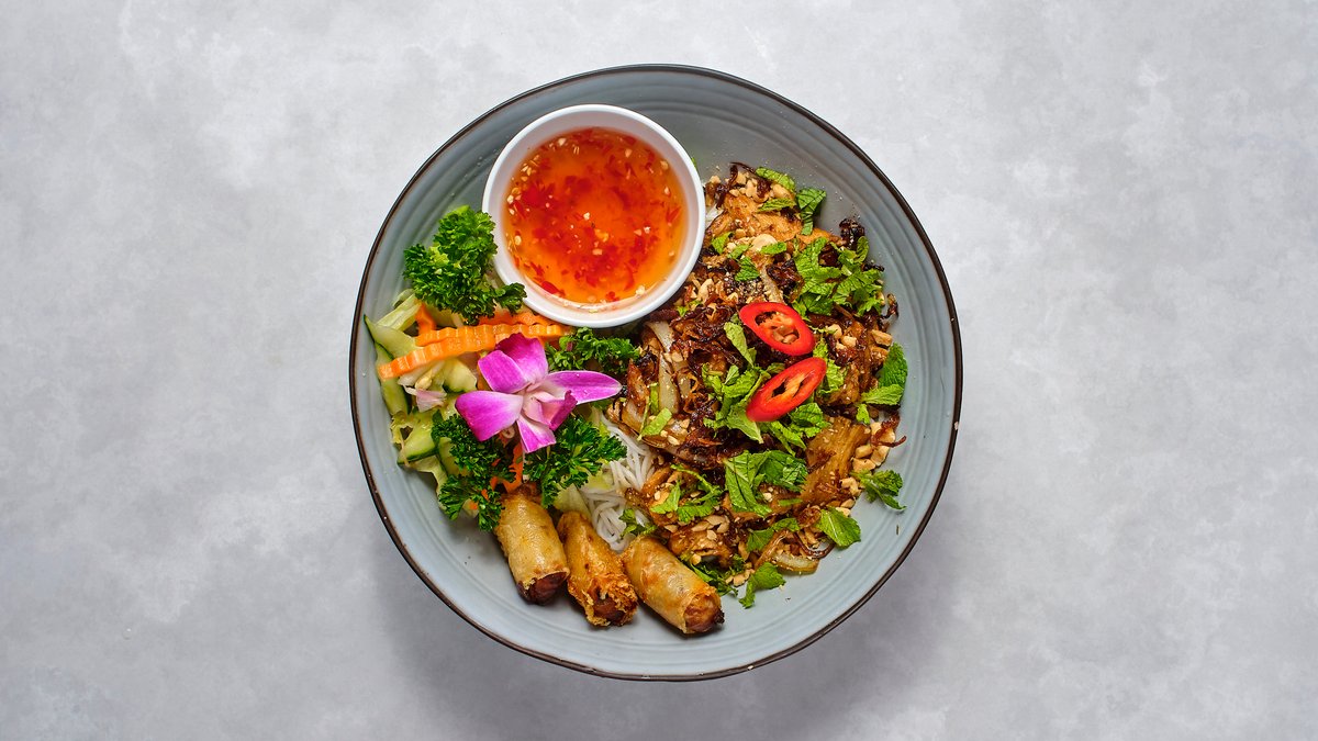 Wokad tofu, risnudlar, vegetariska vårrullar, asiatiska örter, jordnötter och hemgjord sås.