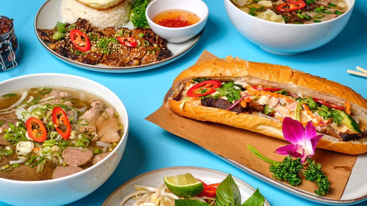 Risnudelsoppa, biffbullar, oxfilé, asiatiska örter på Vietnamesiskt sätt.