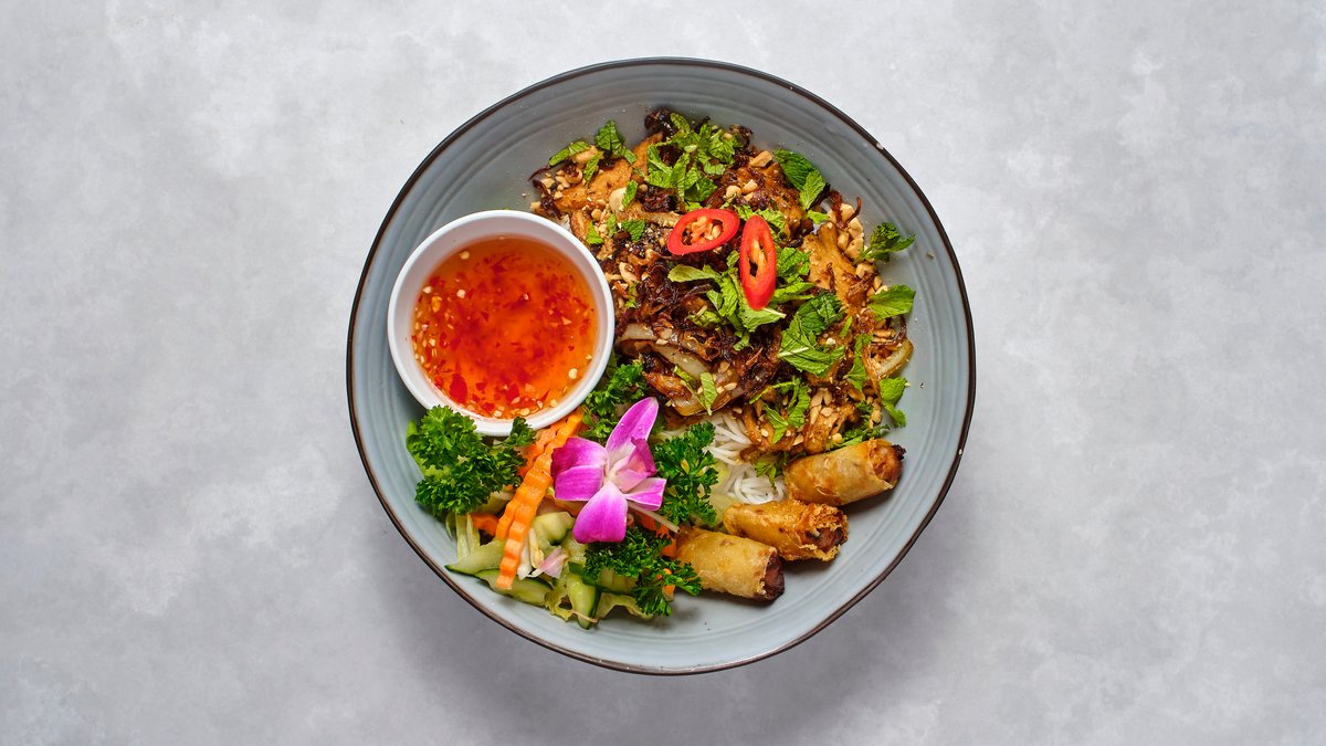 Wokad kyckling, risnudlar, vårrullar, asiatiska örter, jordnötter och hemgjord fisksås