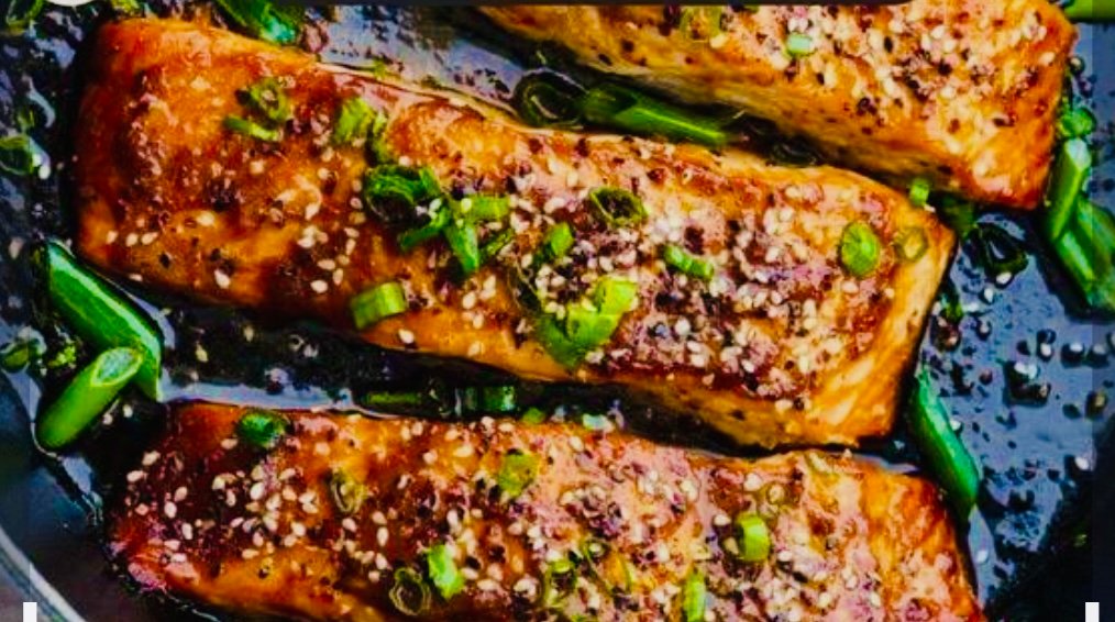 Stekt laxfisk med teriyakisås, grönsaker och ris.