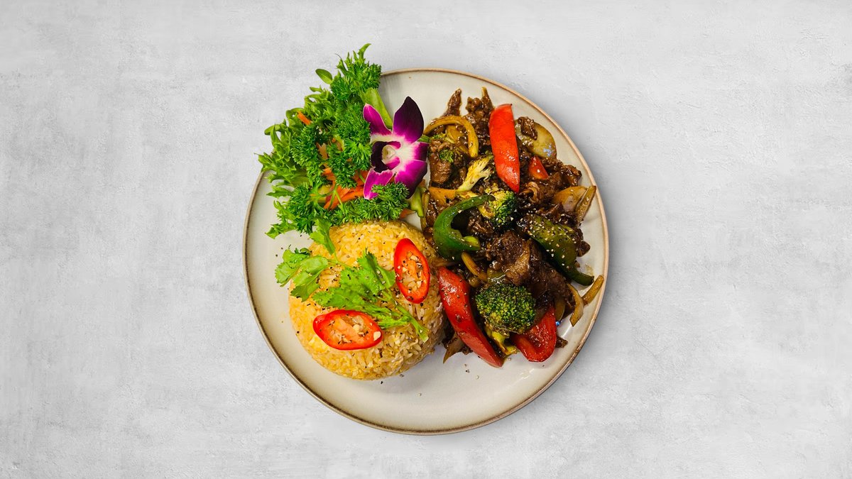 Wokad oxfilé, svamp, grönsaker. Serveras med ris