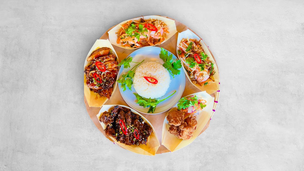Bao Bun, krispig kycklingfilé, sallad med chilidips och grillsås.