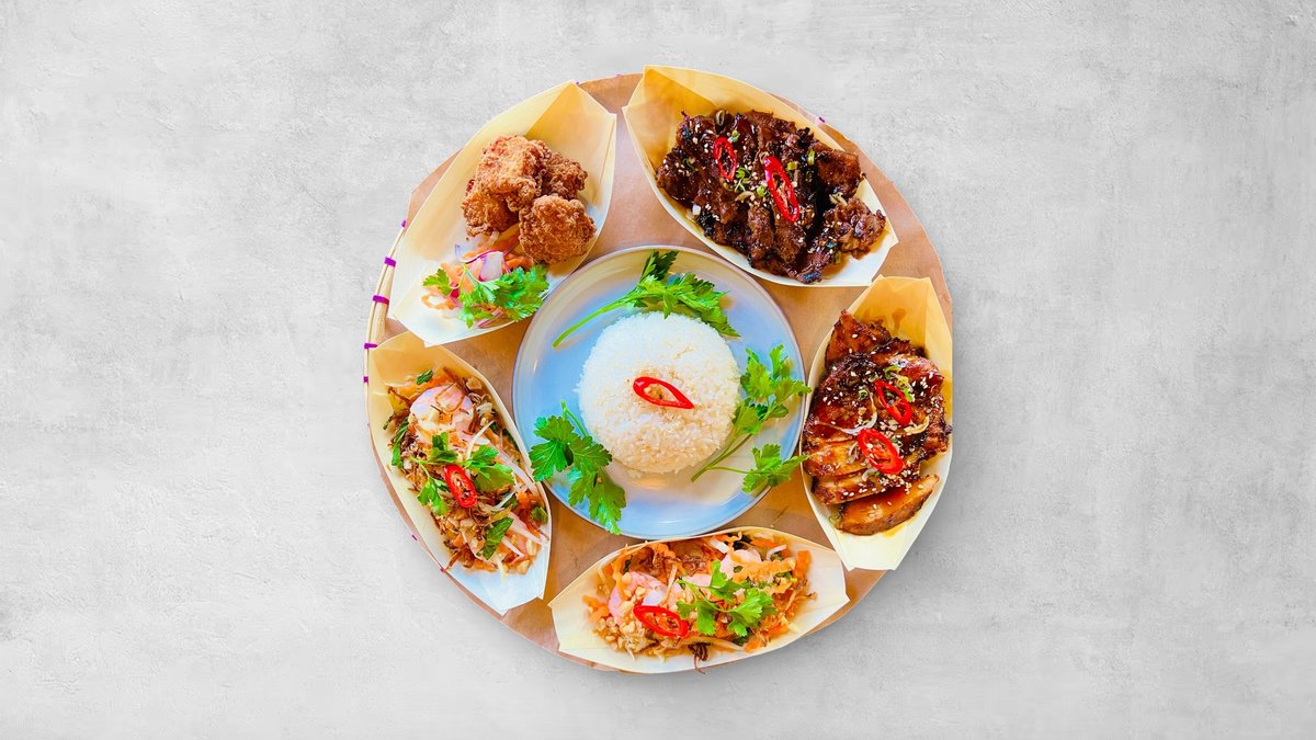 Bao Bun, krispig kycklingfilé, sallad med chilidips och grillsås.