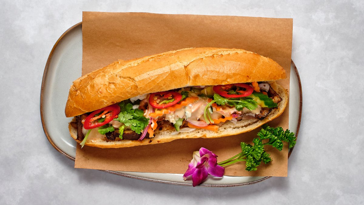 Baguetter fläskkorv, fläsk BBQ, dressing, asiatiska örter på Vietnamesiskt sätt.