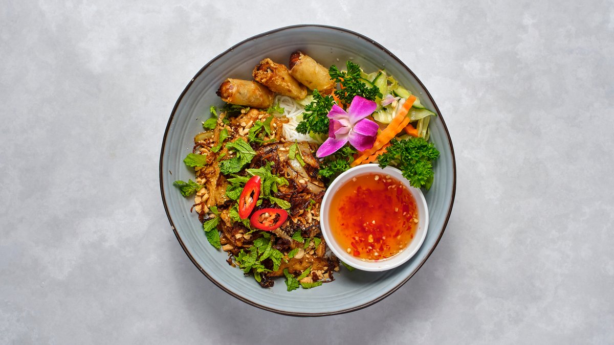 Wokad tofu, risnudlar, vegetariska vårrullar, asiatiska örter, jordnötter och hemgjord sås.