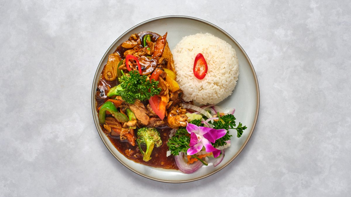 Wokad kycklingfilé, svamp, grönsaker. Serveras med ris