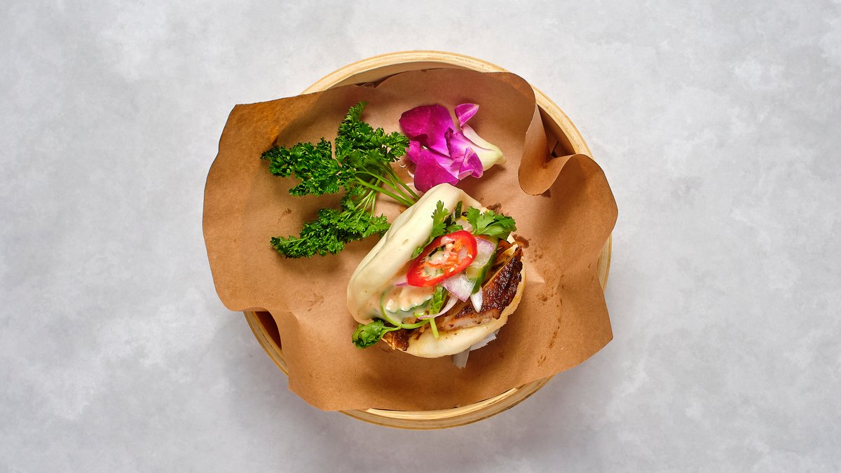 Bao Bun, krispig kycklingfilé, sallad med chilidips och grillsås.