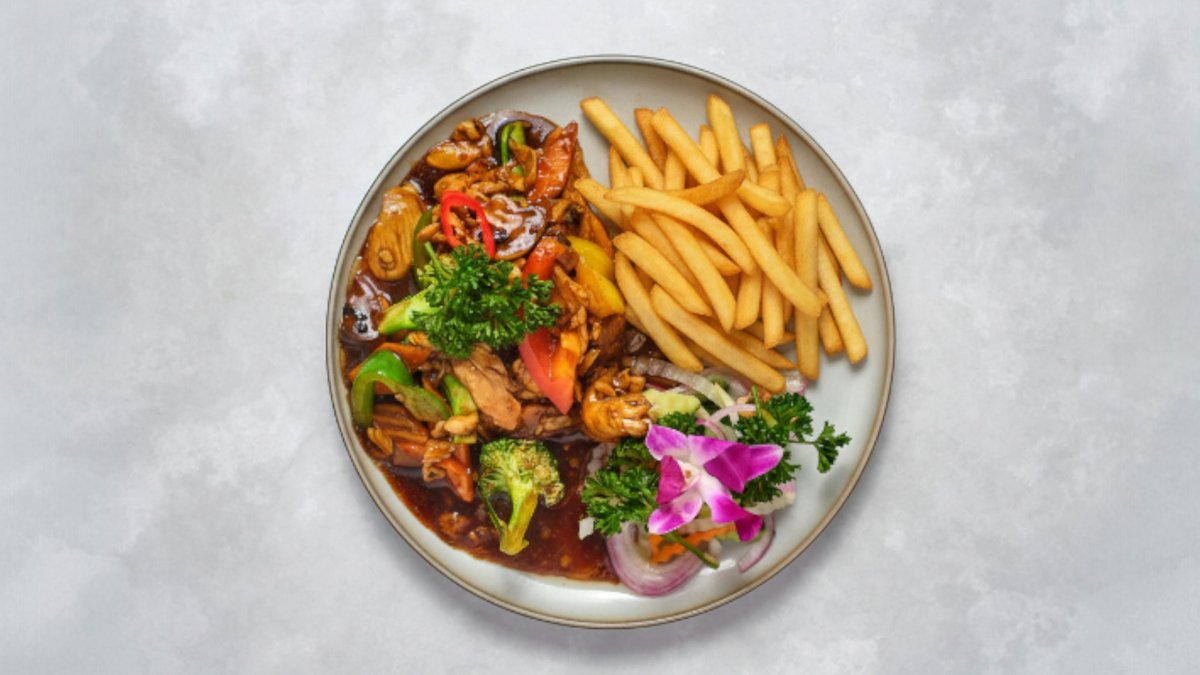 Wokad oxfilé med grönsaker och pommes frites.