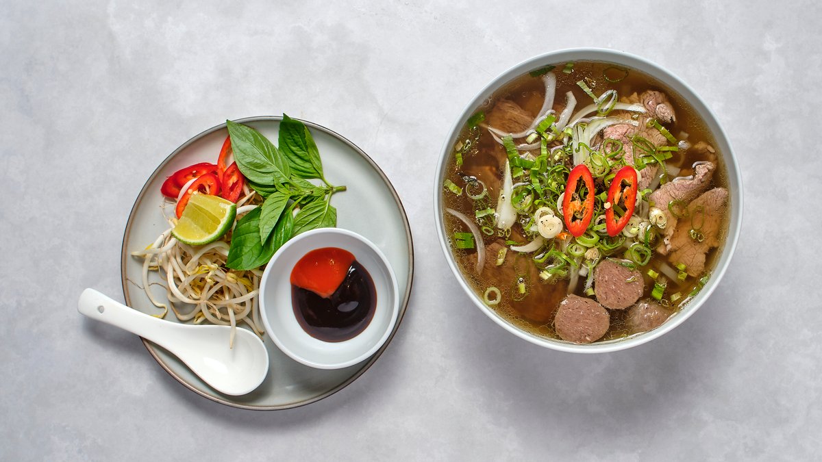Risnudelsoppa, biffbullar, oxfilé, asiatiska örter på Vietnamesiskt sätt.