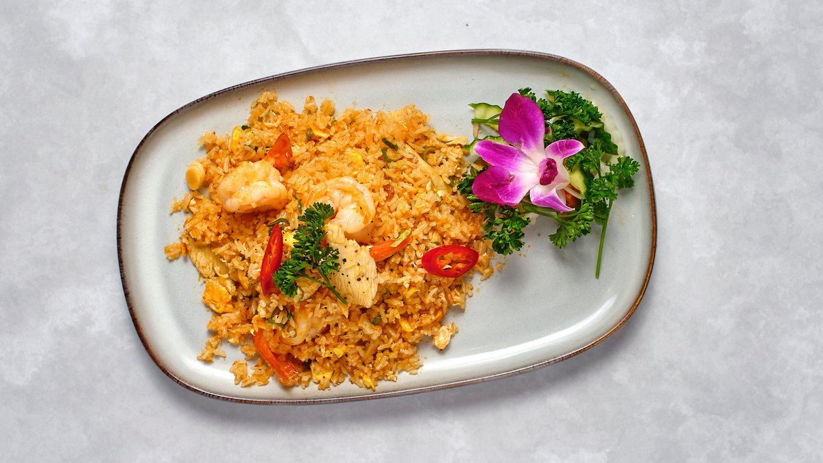 Stekt ris med kycklingfilé och räkor på Vietnamesiskt sätt.